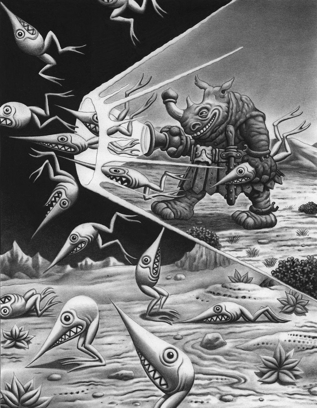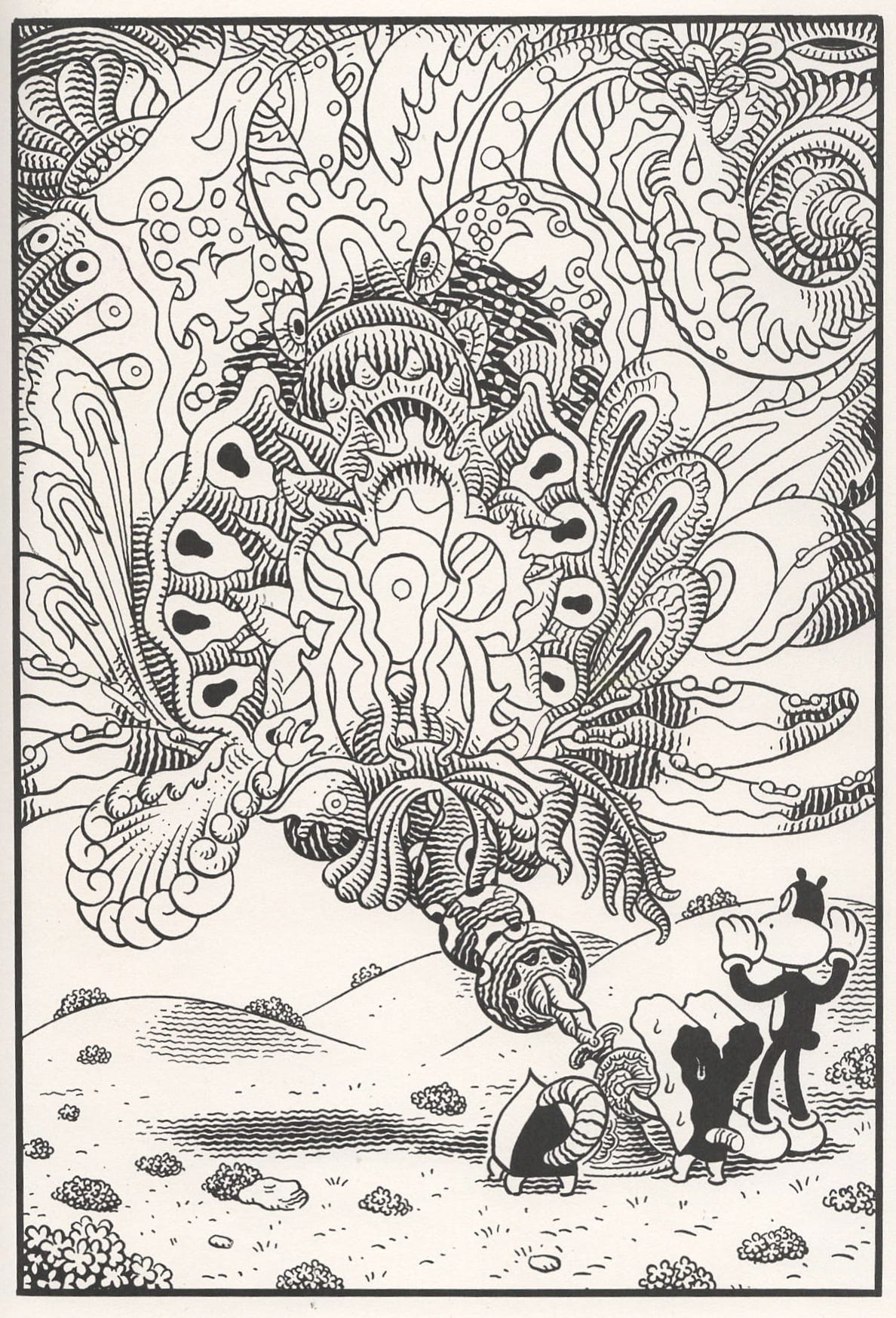 Jim Woodring is one of America’s greatest artists. His primary body of work centers on the character Frank, a vaguely anthropomorphic animal entity who moves through a surreal world called the Unifactor. Words will fail me, so here’s a great example: