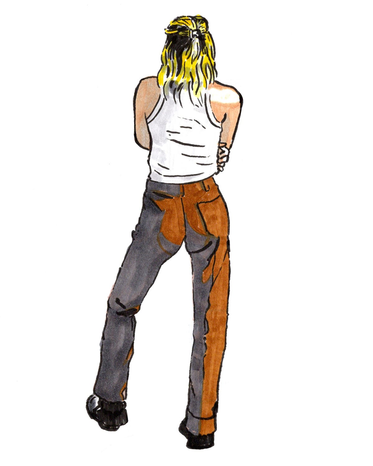 The illustration I’m actually challenging myself with this week isn’t ready to share just yet, but I know the character’s design will involve a tank top and carpenter jeans. I’ve never been great at fabric folds in pants, so I wanted to give it a go. Copic markers have been a reliable tool during this week’s exercises.